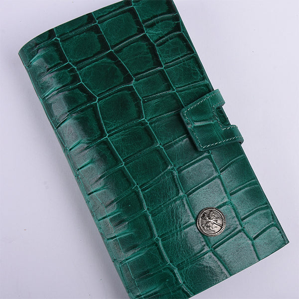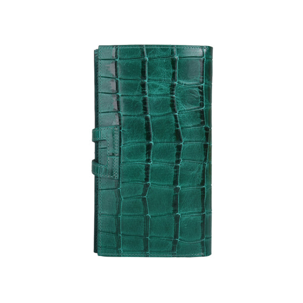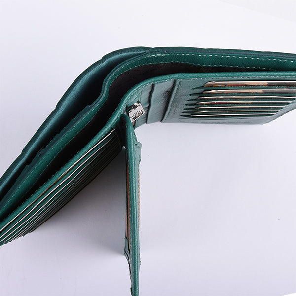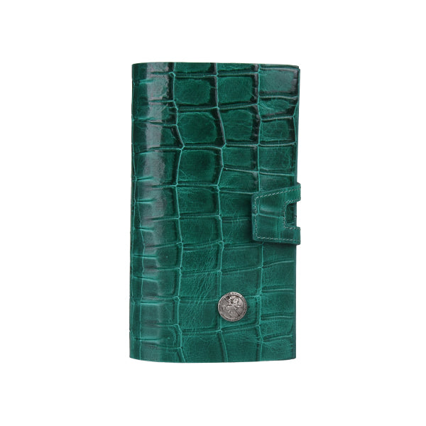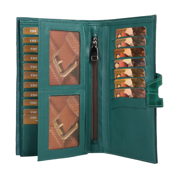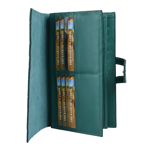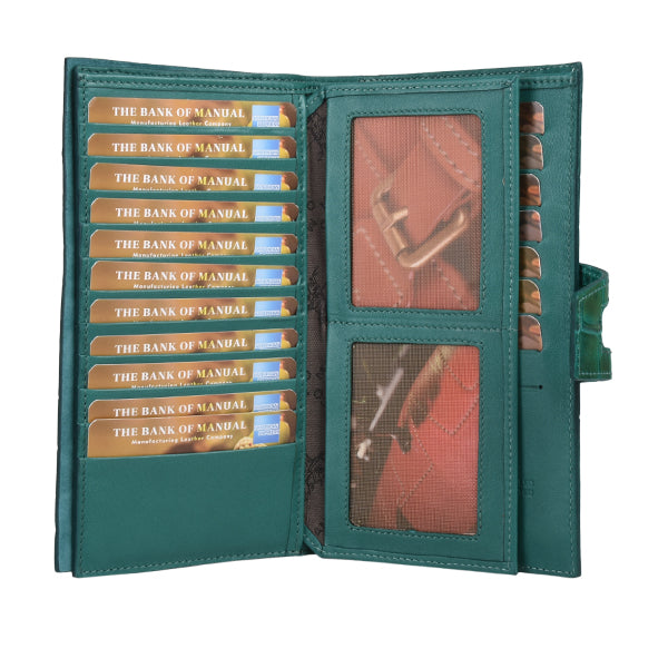Das Lederportemonnaie mit klaren Linien bietet über 20 Kartenfächer und ausreichend Platz für Papiergeld. Auf der Vorderseite ist das Logo von The Manual Co. verziert, und es wird mit einer Schnalle geschlossen.